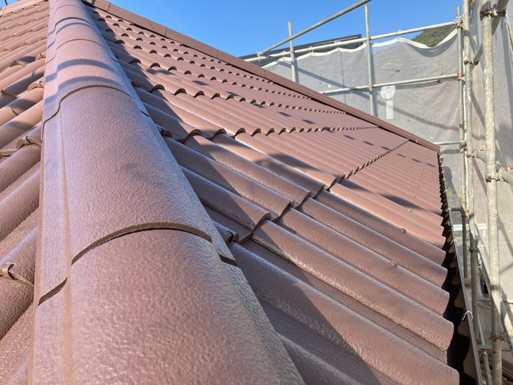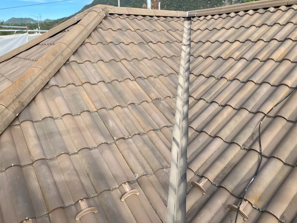 この屋根自体の商品名は明確には分からなかったのですが、素材がセメント系の瓦の為、下地に高付着の溶剤シーラーを塗れば問題無く施工可能との事でした。