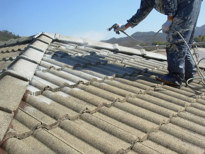 まずスラリー強化プライマーを吹いていきます。当店では基本的にモニエル瓦の場合は吹付けで行います。